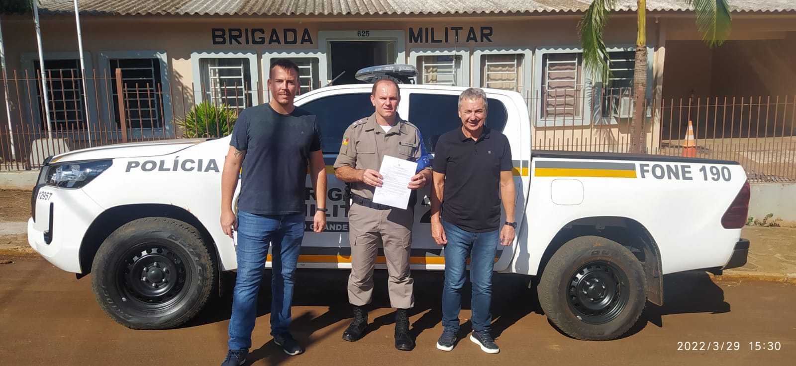 Na tarde desta terça-feira (29/3), Hélio José Scherer, sócio administrador, e Lucas Rech, do setor administrativo do Moinho Missioneiro Ltda, realizaram a entrega simbólica do valor de R$ 10.000,00 (dez mil reais), ao tenente Menin, comandante da Brigada Militar de Cerro Largo.