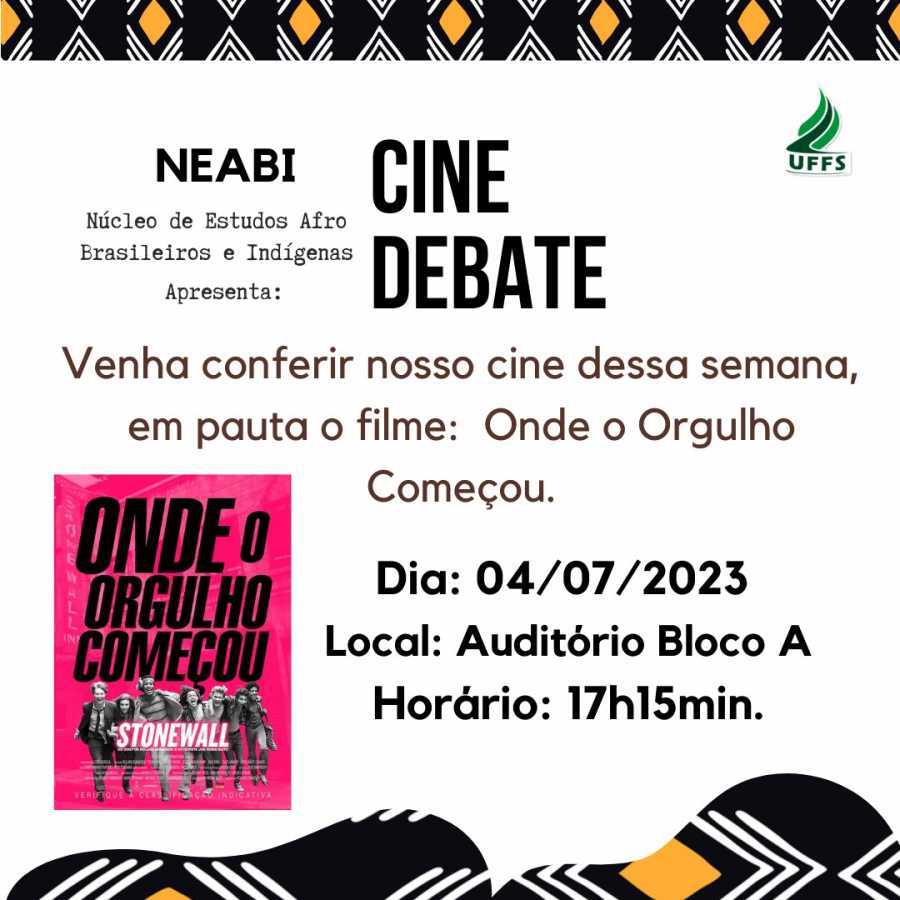 Programação: O Cine Debate é um evento promovido pelo Núcleo de Estudos e Pesquisas Africanos, Afro-Brasileiros e Indígenas- NEABI/Campus Cerro Largo, que acontece de quinze em quinze dias, com entrada gratuita e visa refletir e dialogar sobre filmes e documentários que abordam a temática das relações étnico-raciais, racismo estrutural, preconceito, xenofobia, lgbtfobia, capacitismo, misoginia e temas afins.