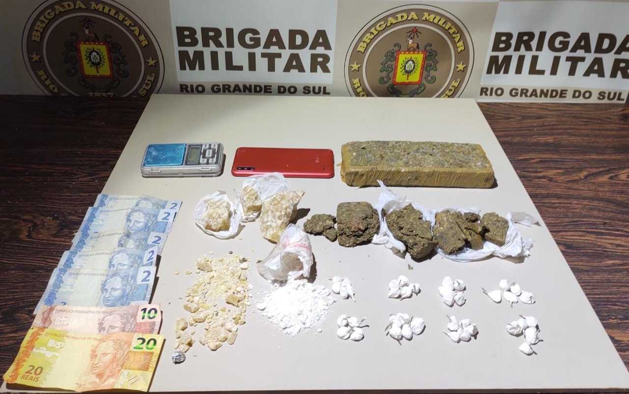 Chegando ao local, foi abordado o acusado em frente ao bar, com porções de drogas em mãos. Em consulta ao sistema, foi confirmado um mandado de prisão expedido pela Comarca de Tramandaí.