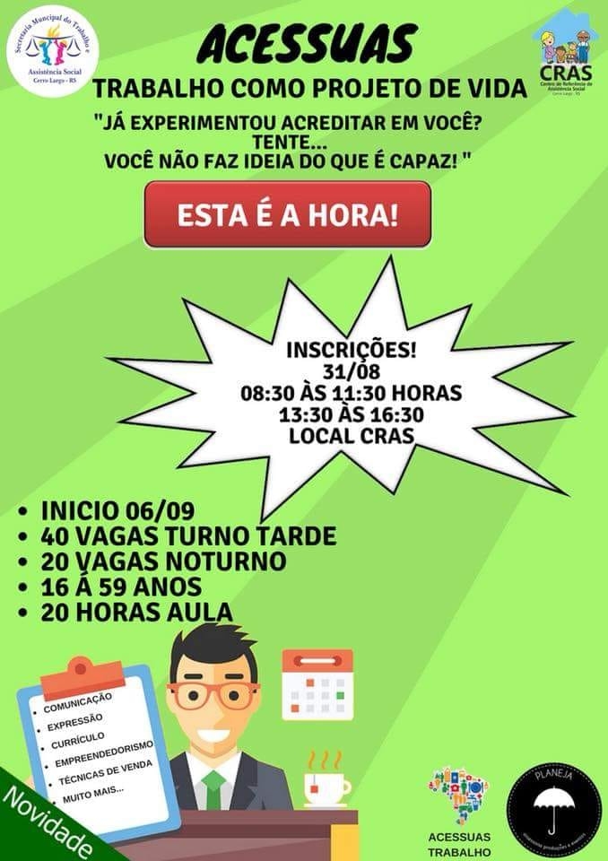 Na próxima sexta-feira, dia 31 de agosto, estarão sendo feitas as matriculas para as oficinas de preparação para o mundo do trabalho, junto ao CRAS de Cerro Largo.