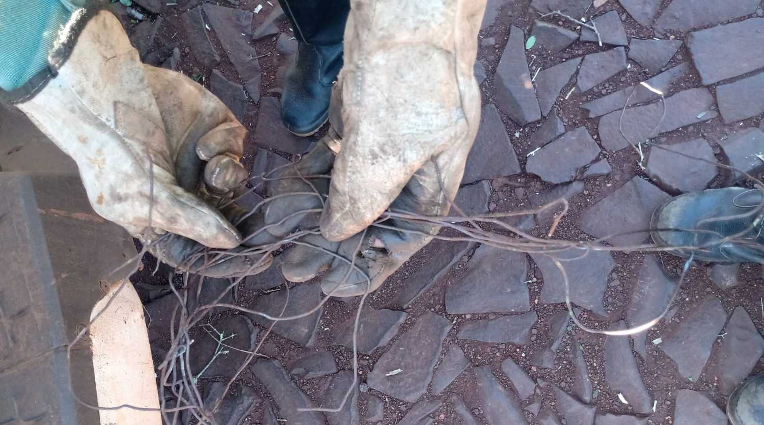 Com a utilização de uma vara de manobra (vara telescópica), os plantonistas Joel Reis e João Oneide Rocha dos Santos realizaram a retirada do arame que casou a queda de energia.