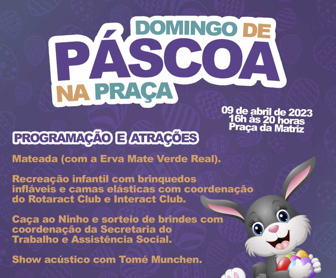 O Governo Municipal de Cerro Largo, por meio da Secretaria da Indústria, Comércio e Turismo, com o apoio da Secretaria do Trabalho e Assistência Social e Secretaria de Educação e Cultura, promove no domingo de Páscoa, dia 9 de abril, o evento Domingo de Páscoa na Praça, na Praça da Matriz, das 16h às 20h.