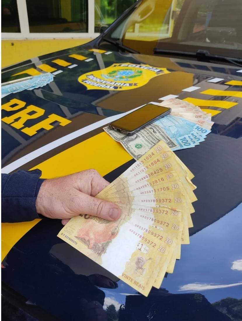 Ao revistarem o automóvel, os policiais encontraram uma carteira com cerca de R$ 3 mil reais, alguns dólares e R$ 400 reais em cédulas de R$ 20 falsificadas.