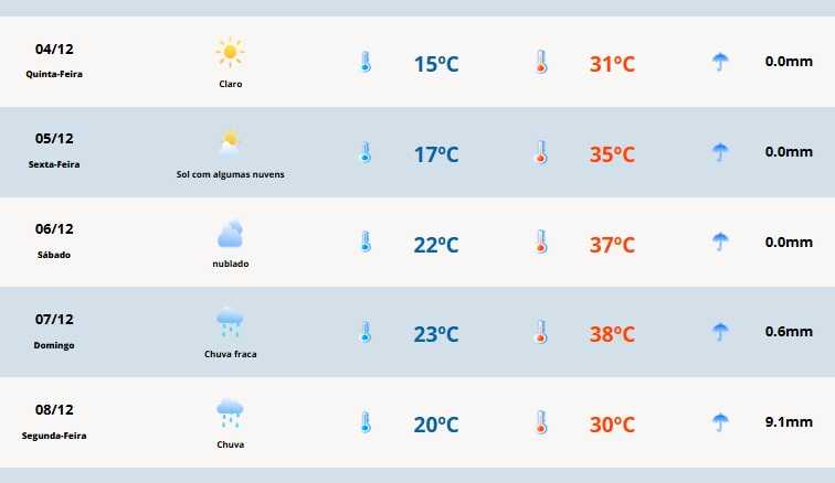 Em Cerro Largo, a previsão é de que as temperaturas fiquem entre 15°C e 31°C; em Porto Alegre, a mínima será de 17°C e a máxima de 30°C.