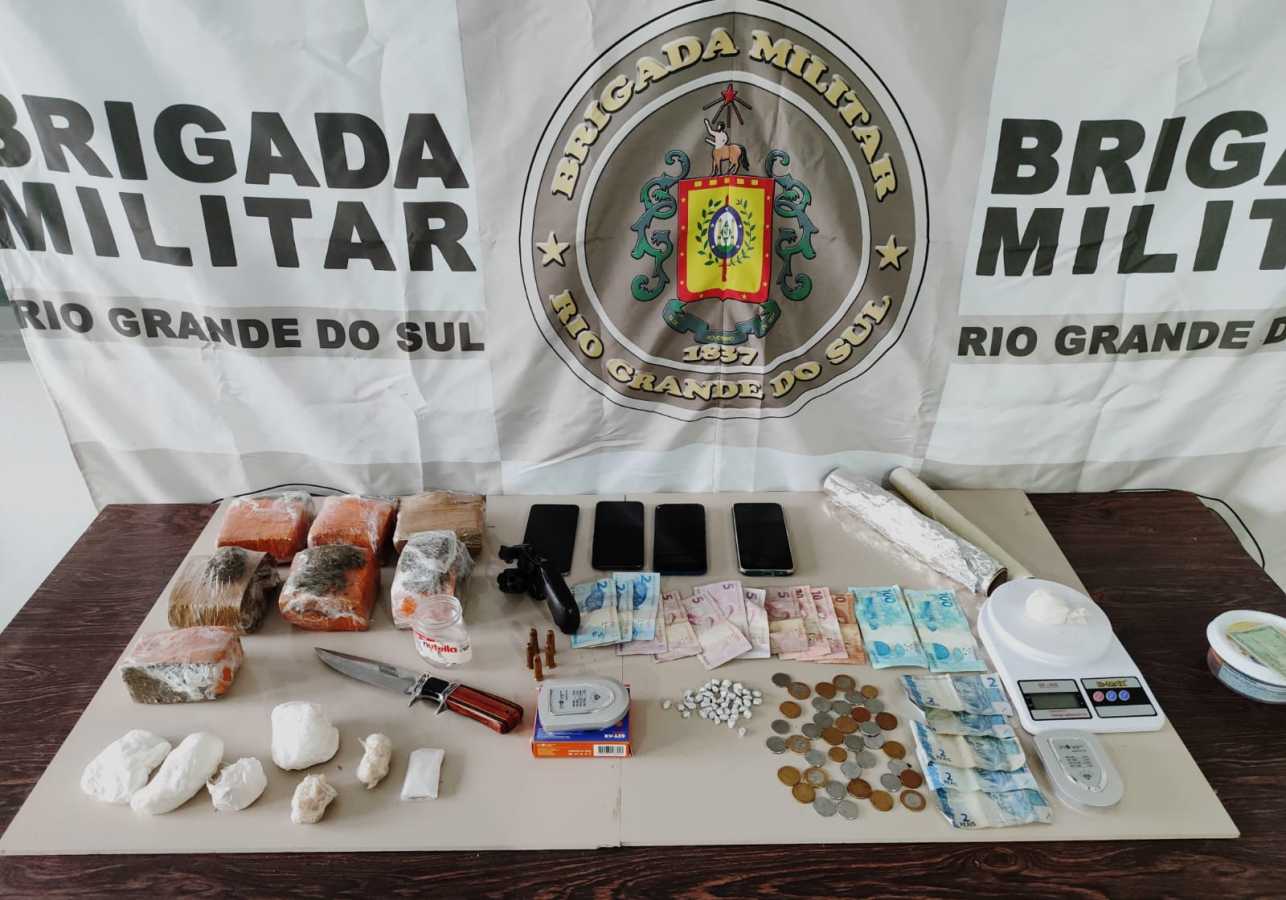 Foram apreendidos 3,343 kg (três quilos, trezentos e quarenta e três gramas) de maconha, 60 gramas de crack e 339g (trezentos e trinta e nove gramas) de cocaína, além de um revólver, quatro munições, três balanças de precisão, quatro aparelhos telefônicos, um punhal, R$ 292,10 em espécie e material para embalar entorpecentes.