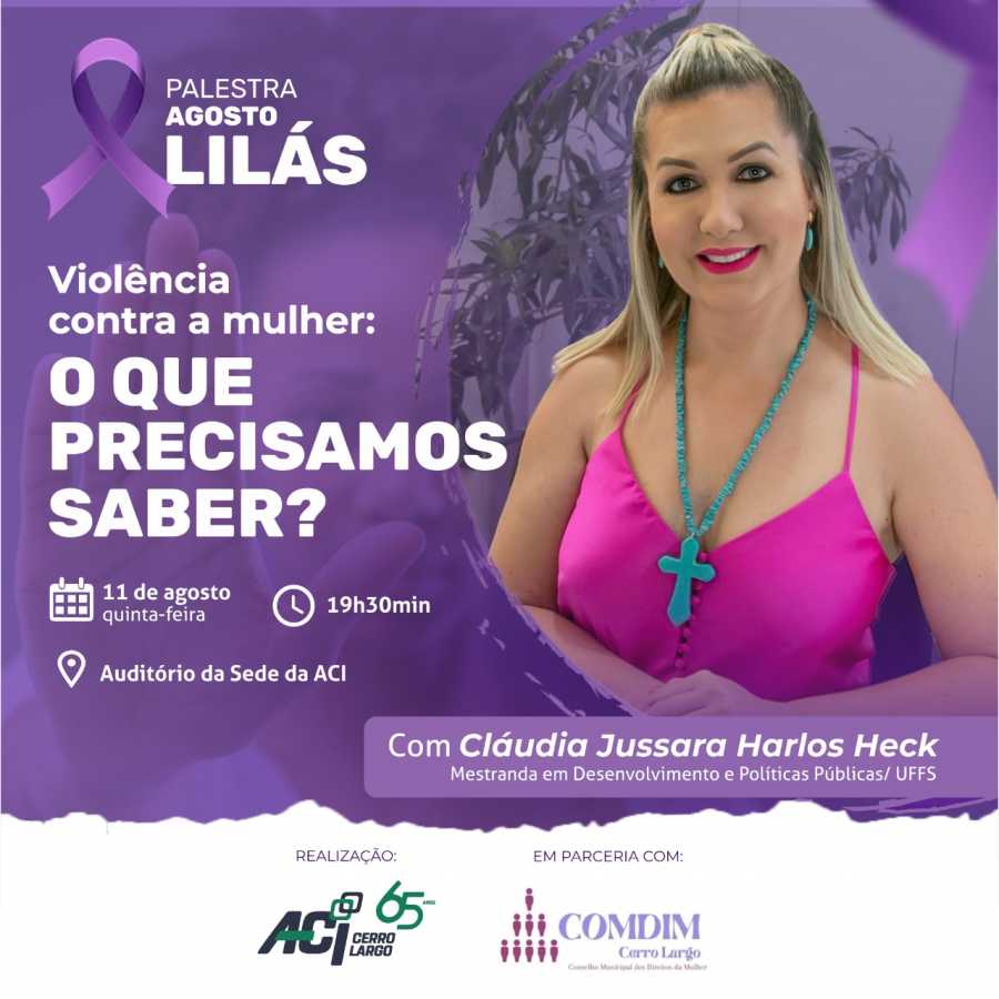 O Grupo de Mulheres que Empreendem e Inspiram, da ACI Cerro Largo, em parceria com o Conselho Municipal dos Direitos das Mulheres (COMDIM ), realizará na próxima quinta-feira, dia 11 de agosto, uma palestra para homens e mulheres, alusiva ao Agosto Lilás.