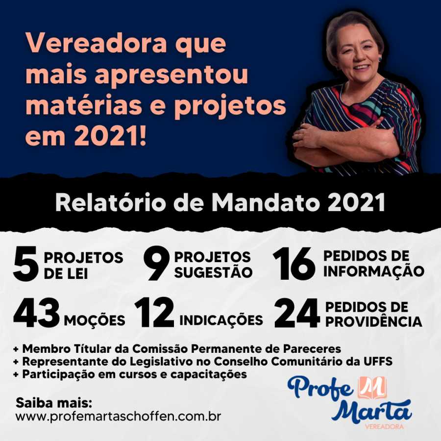 Durante este primeiro ano do mandato, a Profe Marta foi autora de cinco Projetos de Lei Legislativa, entre os quais está a criação de um sistema de transparência na vacinação de Covid-19, a autorização da compra de vacinas e a regulação da fiação aérea em Cerro Largo. Além disso, foi autora de nove projetos de sugestão ao Poder Executivo, solicitando incentivos fiscais a empresas, a isenção no pagamento de alvará para pessoas físicas e microempresas afetadas pelo lockdown, a criação de auxílio às famílias mais necessitadas, a instalação de energia solar nas escolas municipais, entre outros.