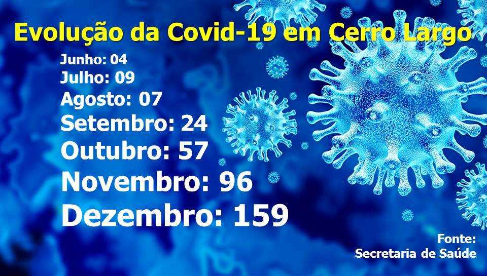 Dezembro de 2020 foi o mês com o maior registro de novas confirmações do novo coronavírus em Cerro Largo - 159, contra 96 casos notificados em novembro. Confira os números: