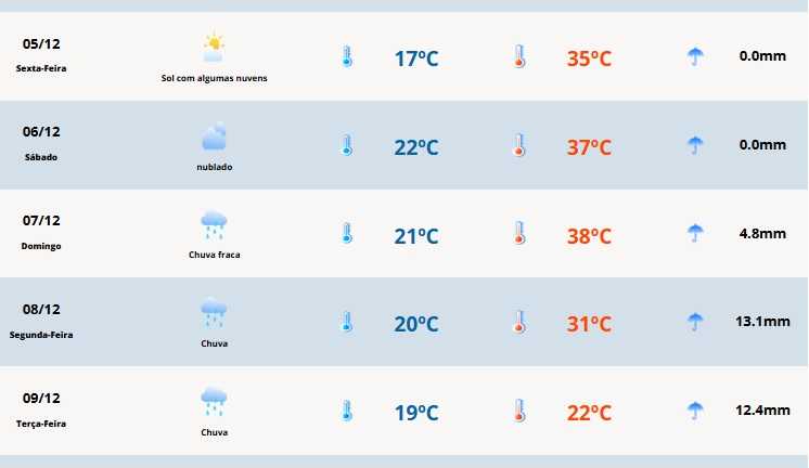 Em Cerro Largo, as marcas oscilam entre 19ºC e 34ºC e em Cruz Alta de 17ºC a 35ºC