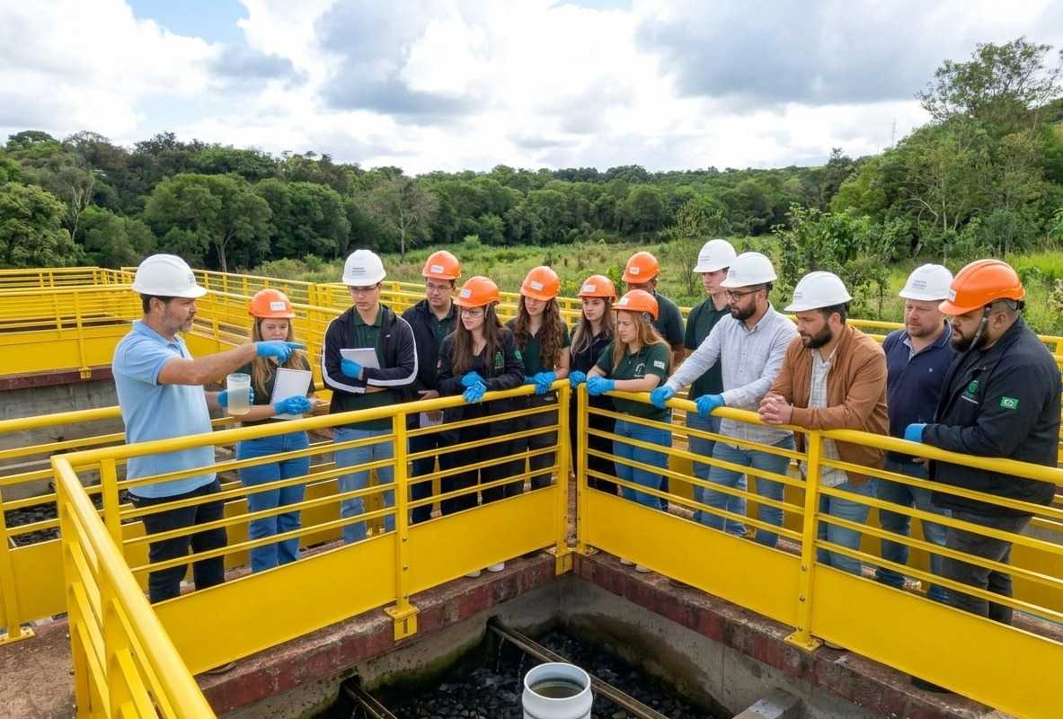 Os estudantes ainda conheceram a estrutura das unidades e observaram de perto os equipamentos utilizados, ampliando a compreensão sobre as tecnologias aplicadas no saneamento. Na ETE, acompanharam as etapas do tratamento de esgoto, compreendendo os processos adotados e a importância do correto manejo dos efluentes para a preservação ambiental.