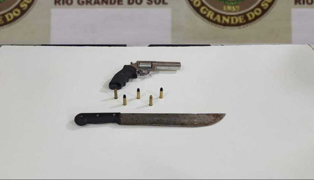 Em deslocamento, a guarnição avistou dois indivíduos em uma motocicleta, sendo abordados e identificados. Em revista pessoal, foi encontrado na cintura de um deles um revólver calibde 38, com 05 munições e um facão.