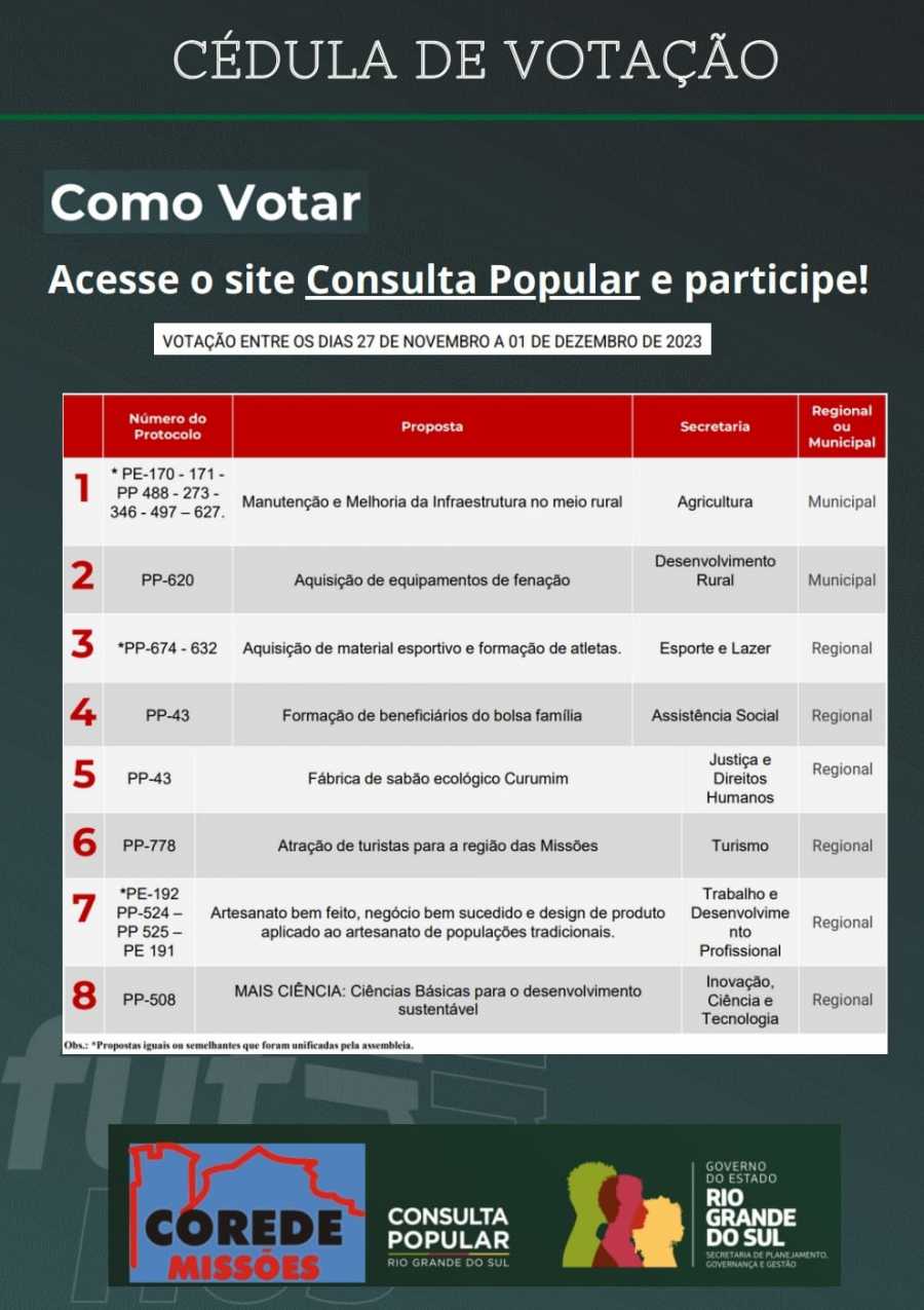 O Conselho Regional de Desenvolvimento das Missões – COREDE/Missões está divulgando a cédula de votação da Consulta Popular 2023, que acontecerá entre 27 de novembro e 1º de dezembro.