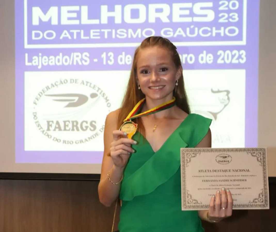 A atleta cerro-larguense Fernanda Sandri Schneider recebeu o prêmio de Atleta Destaque Nacional da Faergs. Ela é atualmente atleta da Associação Noroeste Runners (ANR) e treinada por Paulo Poersch, de Ijuí.