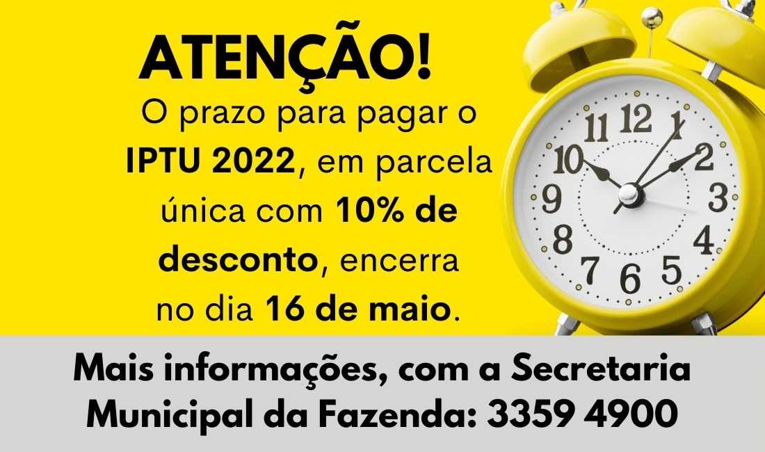 ATENÇÃO para o vencimento do IPTU 2022 - em Parcela Única - até o dia 16 de maio (segunda-feira), com desconto de 10% (dez por cento).