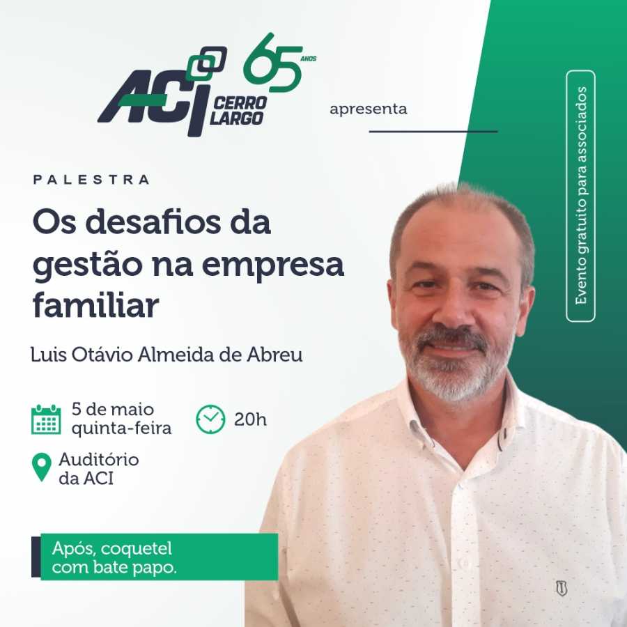 ACI Cerro Largo 65 anos apresenta a palestra Os desafios da gestão na empresa familiar, com o consultor Luis Otávio Almeida de Abreu. O evento será na próxima quinta-feira, 5 de maio, às 20h no auditório da associação.