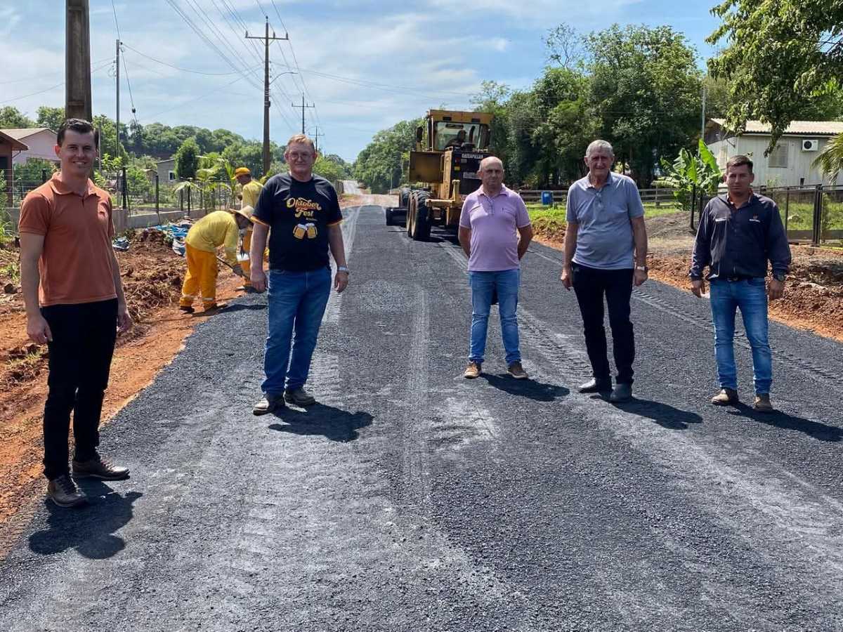 Na manhã de sexta-feira (14/11), o prefeito Pedro Butzen esteve no local acompanhando o andamento dos trabalhos. Ele foi acompanhado pelo secretário de Obras, Valdir Welter, pelo secretário de Agricultura, Charles Scherer, e pelo secretário adjunto de Obras, Carmo Lunkes, além de representantes da empresa responsável pela execução do serviço.