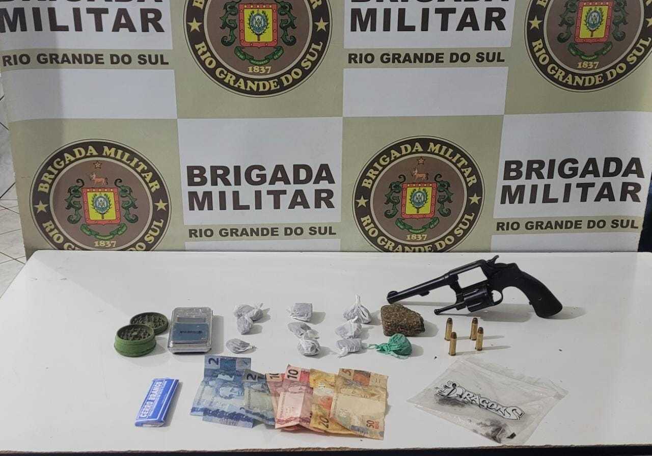 Realizado monitoramento nas proximidades da residência, foram constatadas entradas e saídas de usuários. No momento que um indivíduo chegou em frente à residência, alcançou uma cédula e recebeu uma porção de substância, ambos foram abordados e em busca pessoal, no bolso do casaco de um dos indivíduos foram localizadas nove porçoes de entorpecentes, bem como em sua cintura um revólver, municiado com quatro munições intactas. Já no interior da residência, em uma estante foi localizada uma balança de precisão e o restante dos entorpecentes.