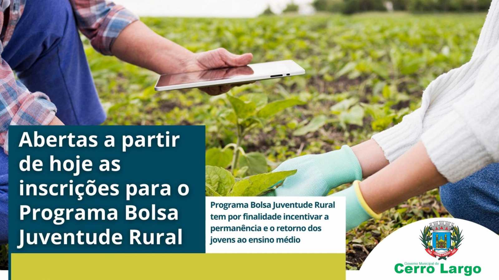 O Governo Municipal de Cerro Largo, por meio da Secretaria da Agricultura e Expansão Econômica, informa que estão abertas as inscrições para o programa Bolsa Juventude Rural, voltado para jovens estudantes do Ensino Médio, que têm entre 15 e 29 anos.