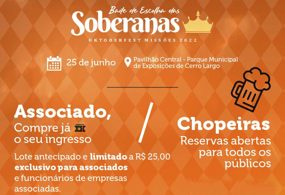 Nesta quarta-feira (25/5), teve início a comercialização dos Ingressos Antecipados e das Chopeiras para o Baile de Escolha das Soberanas da Oktoberfest Missões 2022, que se realizará no dia 25 de junho, com animação da Banda Cosmo Express.