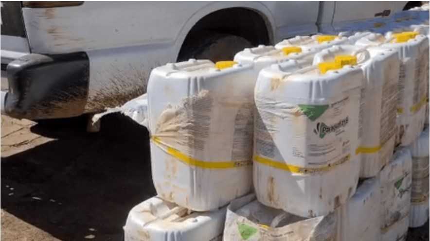 Em diligências, foi localizada uma caminhonete GM S-10, branca, com 35 galões de 20 litros de veneno Paraquat.