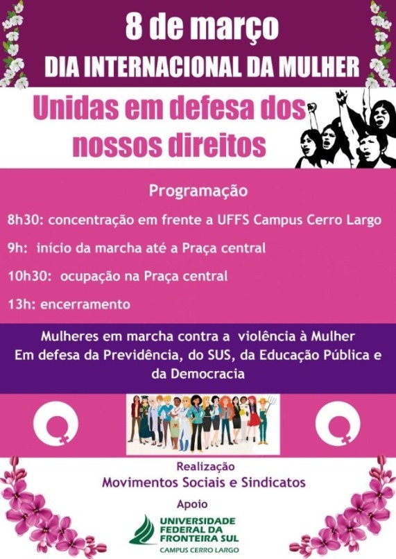 Será realizada amanhã, no Dia Internacional da Mulher - 8 de março - uma marcha em defesa dos direitos das mulheres no município de Cerro Largo.