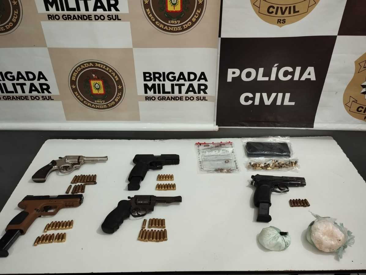 Foram presos cinco indivíduos, enquanto um menor foi apreendido, sendo também apreendidas três pistolas e dois revólveres, além de munição.