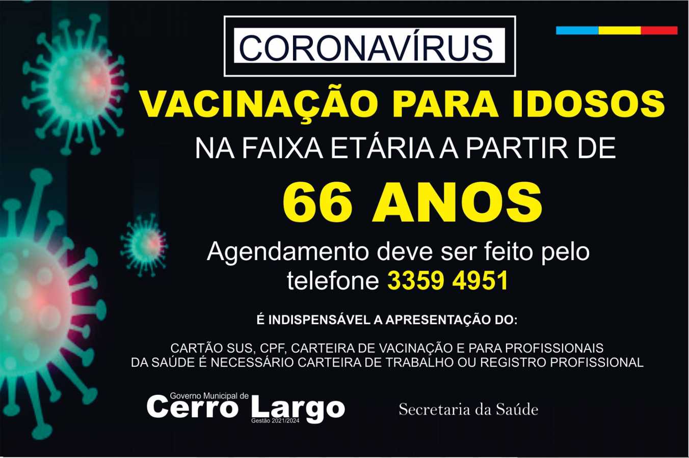 O Governo Municipal de Cerro Largo, por meio da Secretaria de Saúde, informa que está recebendo 380 doses das vacinas CoronaVac, do Instituto Butantan, e Oxford/Astrazeneca, da Fio Cruz, que serão destinadas à população idosa de 66 anos ou mais, conforme critérios impostos pela Secretaria Estadual de Saúde (RESOLUÇAO N° 036/21).