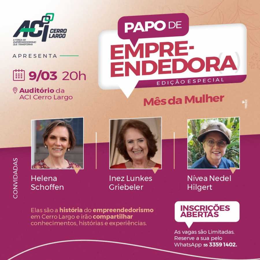 E o primeiro evento da ACI Cerro Largo acontece no dia 9 (quinta-feira), a partir das 20h, com uma edição especial do Papo de Empreendedora, com três convidadas que fazem parte da história do empreeendedorismo no município: Inez Lunkes Griebeler, Nívea Nedel Hilgert e Helena Schoffen.