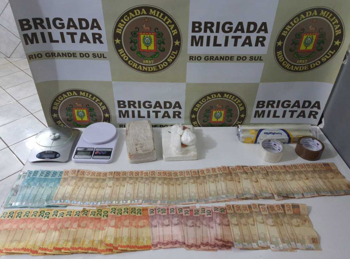 Em busca pessoal, foram localizados na mochila R$ 3.860,00 (em cédulas diversas), 1 kg de cocaína, 1 kg de crack, 2 balanças de precisão e material para embalar a droga.