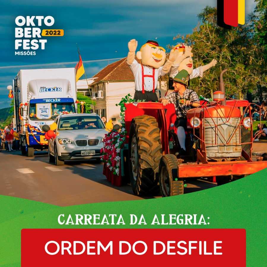 A Carreata da Alegria, desfile festivo que marca a abertura da Oktoberfest Missões 2022, acontece a partir das 17h desta quinta-feira (6/10) e, apesar da leve instabilidade climática, está mantida (saiba mais AQUI). Confira a ordem do desfile: