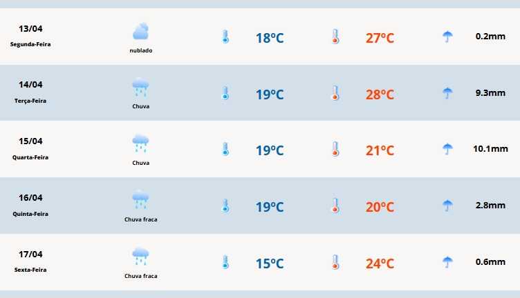 Em Cerro Largo, a temperatura mínima será de 18°C, enquanto a máxima será de 27°C.
