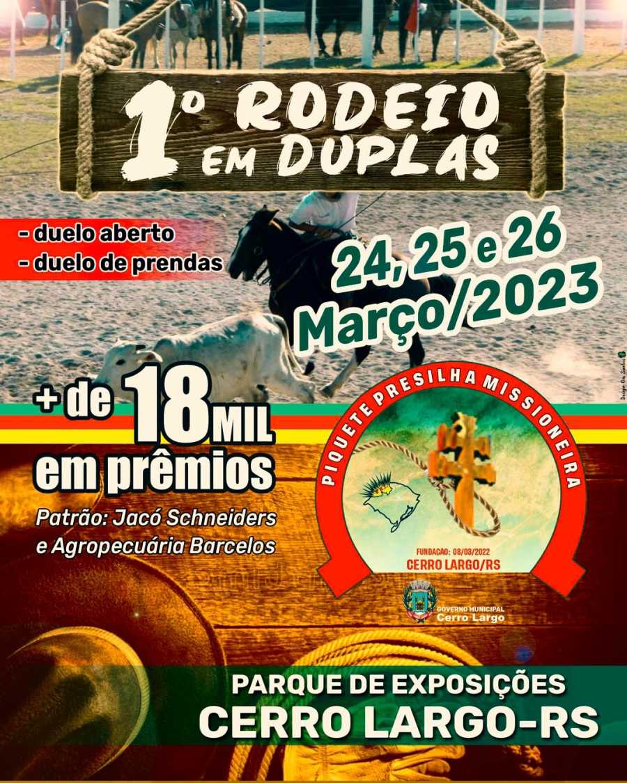 Numa promoção do Piquete Presilha Missioneira, acontece nos dias 24, 25 e 26 de março a primeira edição do Rodeio em Duplas, com mais de R$ 18 mil em premiação, no Parque de Rodeios do Parque de Exposições Elemar Kuhn, em Cerro Largo.