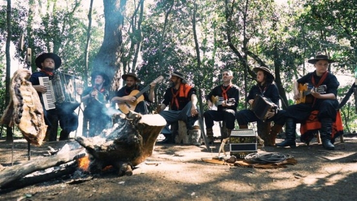 Formação completa do grupo durante as gravações do clipe de Das Barrancas do Uruguai