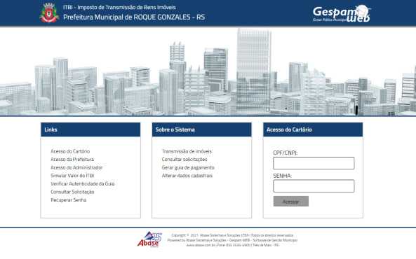 A Administração Municipal com enfoque na otimização da gestão pública local e na desburocratização, implementou esta semana, o programa ITBI Eletrônico, que visa facilitar e agilizar os processos administrativos quando da tributação decorrente da aquisição de imóveis no Município. Trata-se de um software moderno implantado pela Abase Sistemas, que interligará os Cartórios e Imobiliárias ao Setor de Tributário Municipal.