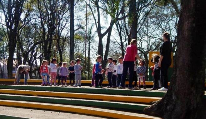 Na tarde de ontem (29), alunos do Maternal 3, da EMEI Menino Jesus, estiveram ensaiando na Praça Tiradentes, para se apresentar nas comemorações alusivas ao Dia da Pátria, que serão realizadas neste sábado, 1º de setembro.