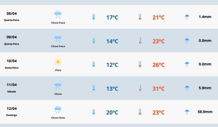 A instabilidade segue com muitas nuvens e pancadas de chuva nas faixas Norte e Leste. No Oeste, a tendência é de sol com nuvens. As temperaturas apresentam pouca variação ao longo do dia, mas a sensação de frio será maior em razão do vento.