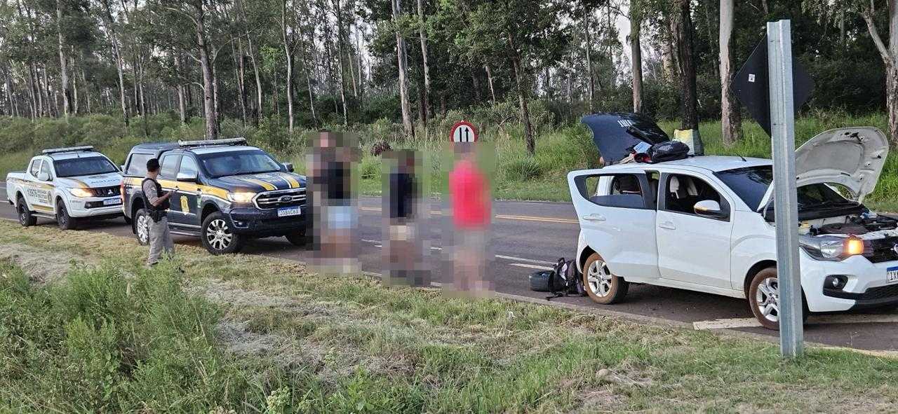 Após receberem informações da BM de que autores de furtos em estabelecimentos comerciais daquela cidade estariam se deslocando em um Fiat Mobi para a região de Santiago, policiais rodoviários federais iniciaram as buscas na BR 287 e abordaram o referido veículo. Ao identificar os ocupantes, três homens de 29, 30 e 33 anos, constataram que a descrição igualava com o relato das vítimas dos crimes.