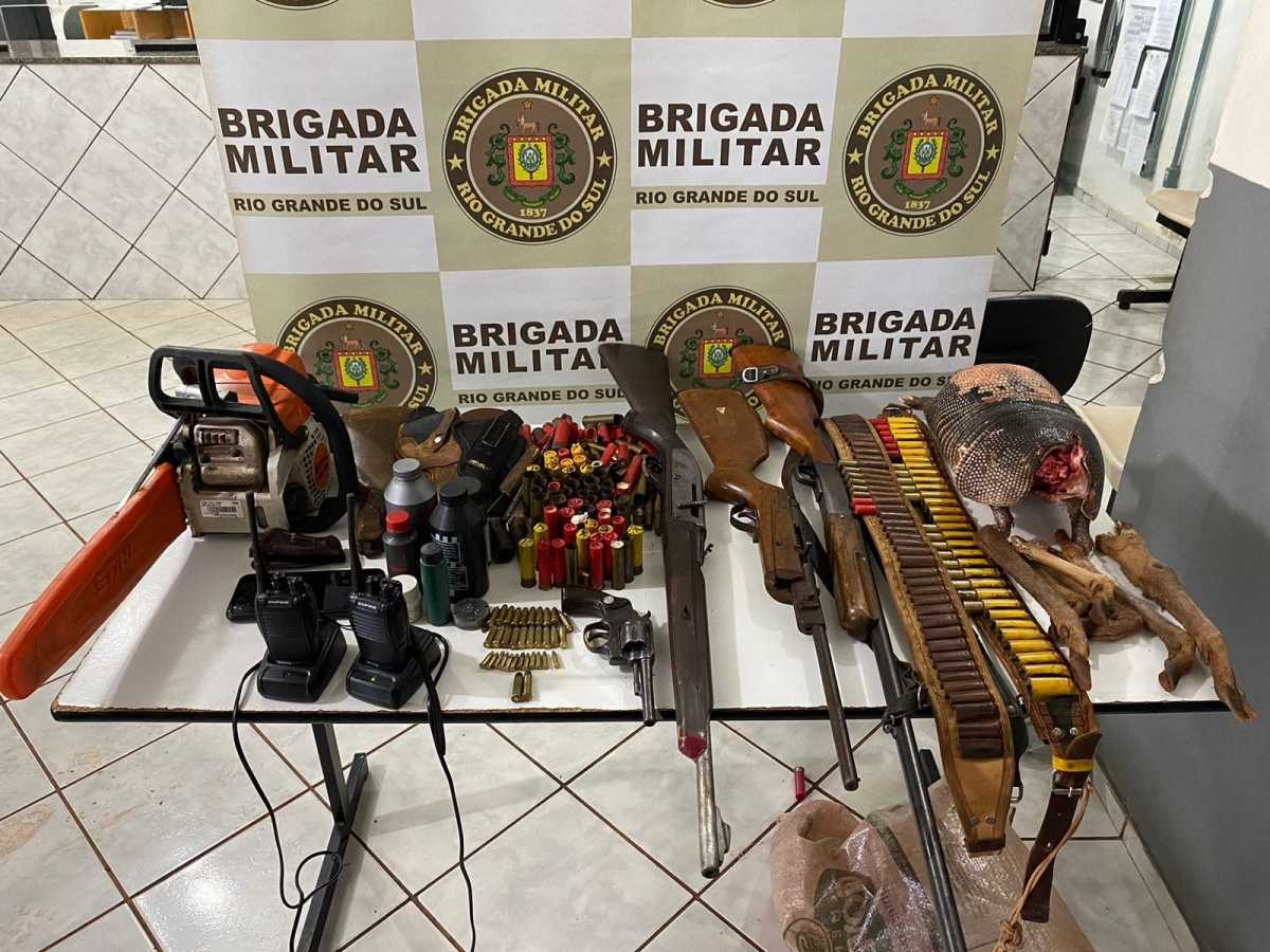 Foram feitas buscas e encontradas mais três espingardas, 130 munições intactas, 57 deflagradas, material para recarga, dois rádios HT, uma motosserra, uma celular, uma carcaça de tatu e seis patas de veado.