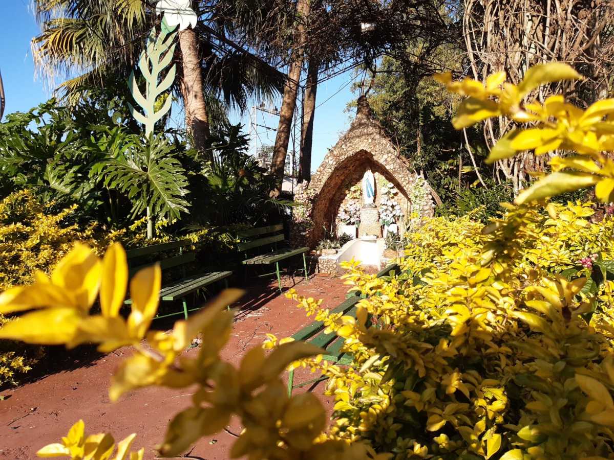A imagem da gruta é a de Nossa Senhora de Lourdes.