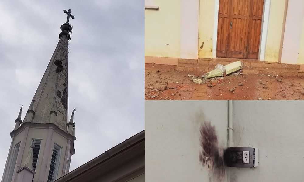 Um raio atingiu a torre da igreja da Linha Santo Antônio, interior de Cerro Largo, durante chuvas na tarde desta quarta-feira (28/02), que aparentemente ocorriam calmamente.
