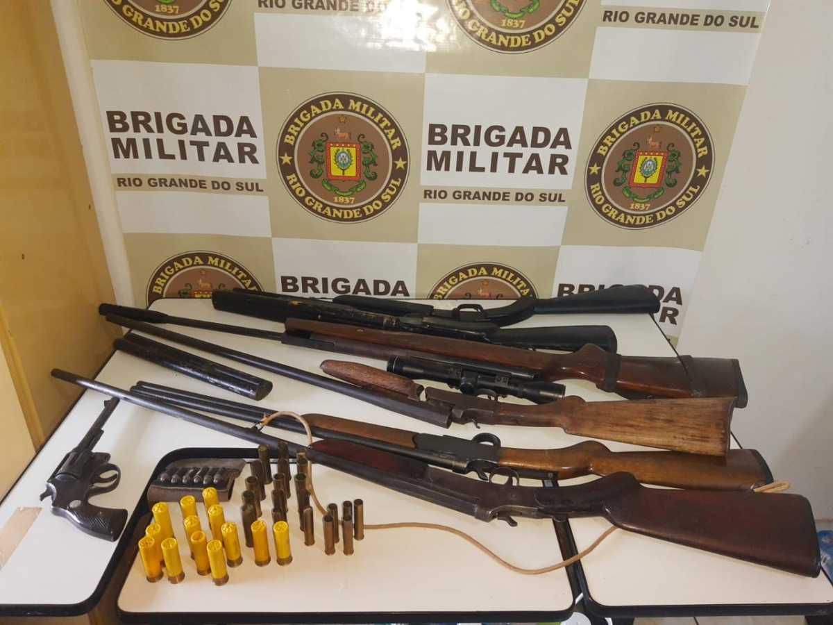 No local, a vitima informou que foi ameaçada com armas de fogo pelo marido e seu sogro. Com o intuito de preservar a vida e integridade física das partes envolvidas, foi iniciada a busca pelas referidas armas. E em um galpão nos fundos da residência, foram localizadas seis espingardas de calibres diversos e um revolver calibre 38.
