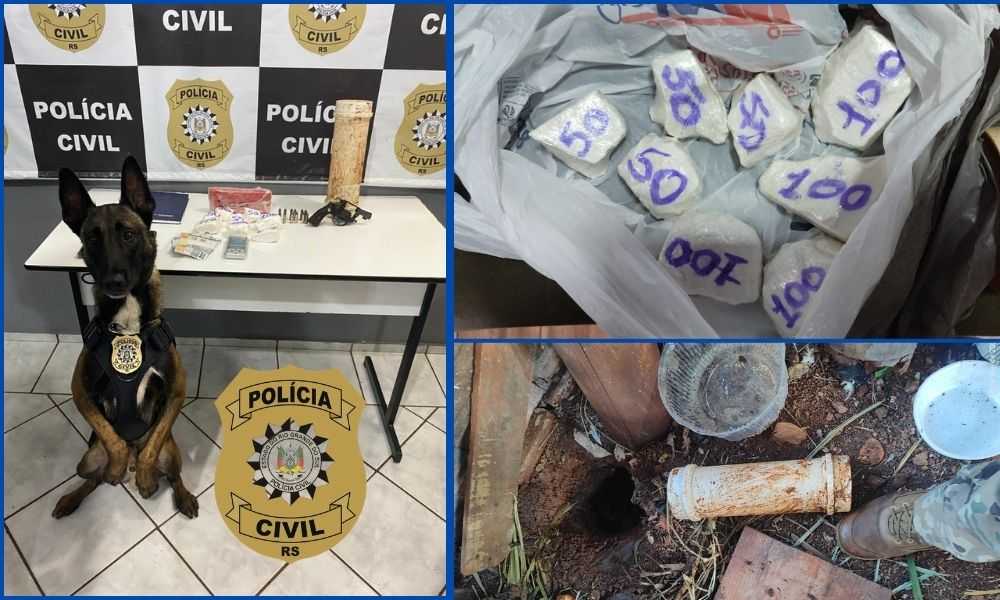 Durante as buscas, foi localizada grande quantidade de drogas enterradas junto a um chiqueiro, um revólver calibre .38, munição, balança para pesagem de drogas e celulares, além de uma motocicleta utilizada para o transporte dos ilícitos.