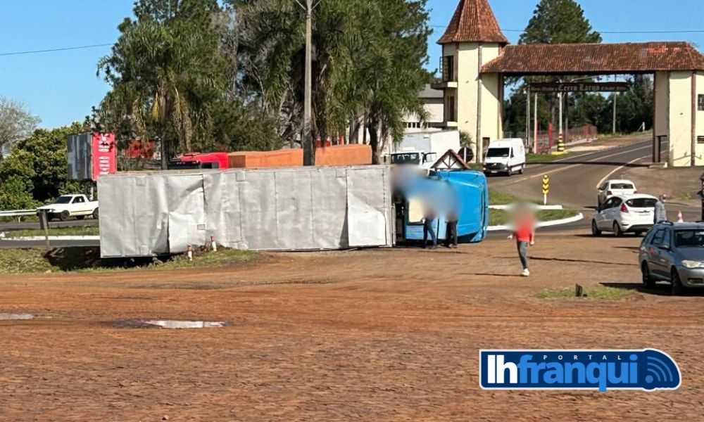 O caminhão, de Caibaté, não venceu fazer o contorno do trevo e acabou tombando, com a carga viva ficando espalhada nas imediações.