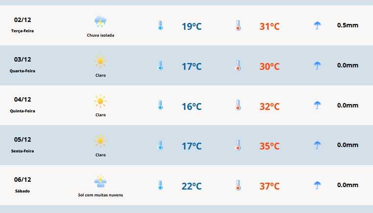 Em Cerro Largo, a temperatura mínima será de 21°C e a máxima de 31°C. Em Porto Alegre, os termômetros variam entre 19°C e 30°C. E em Pelotas, as temperaturas devem oscilar de 18°C a 27°C.