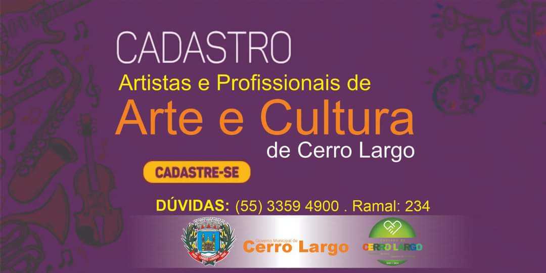 Se você é artista, produtor cultural e atua no setor, participe. Mais informações podem ser obtidas pelo telefone (55) 3359-4900 (Ramal 234) ou pessoalmente na Prefeitura Municipal de Cerro Largo, 2º Andar, junto a Secretária da Indústria, Comércio, Turismo, Comunicação.
