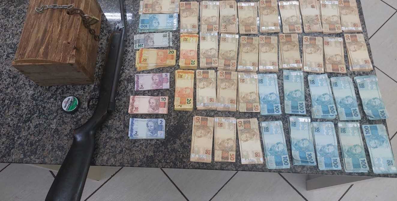Foi localizado com o homem uma caixa de madeira (baú) com correntes e cadeado, com grande quantidade em dinheiro, não tendo explicação da origem das notas.
