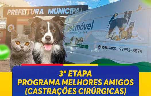 A terceira etapa do Programa Melhores Amigos, que oferece castrações cirúrgicas gratuitas para cães e gatos, será nos dias 23, 24 e 25 de novembro.