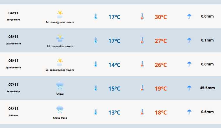 Em Cerro Largo a temperatura mínima será de 16°C e a máxima de 30°C.
