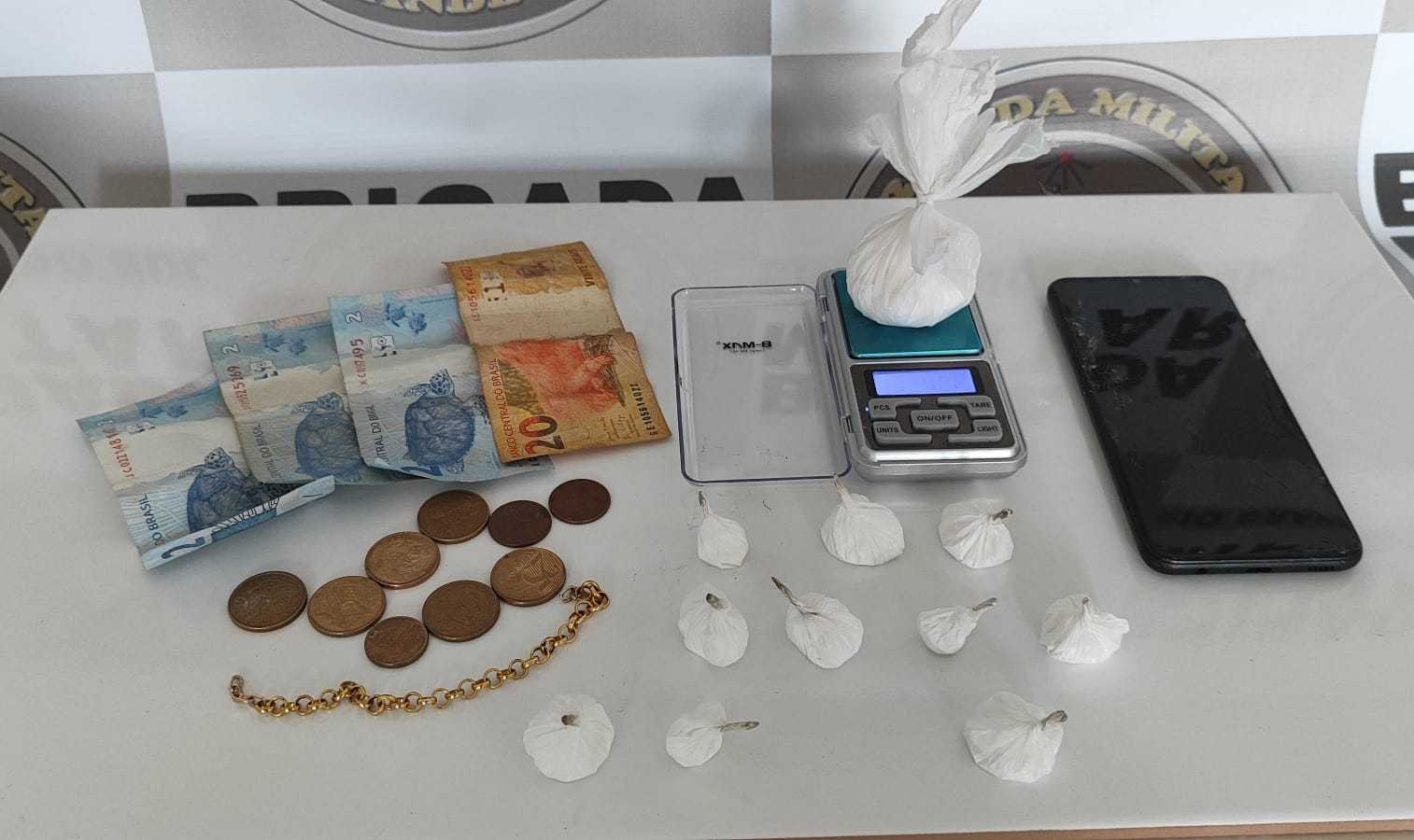 Ao efetuar sua abordagem, foram encontradas em sua posse 10 buchas de cocaína prontas para venda e outra maior, que provavelmente ainda seria fracionada, somando 50 gramas ao todo. O suspeito também carregava uma balança de precisão, R$ 26,70 em espécie, um aparelho celular e uma gargantilha.