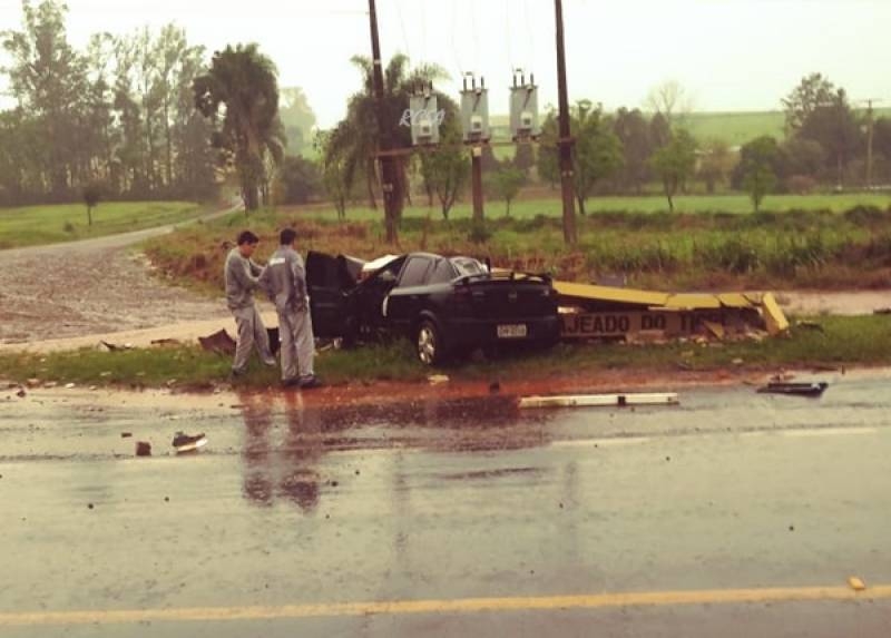 Um veículo Chevrolet Astra, com placas de Cândido Godói, em virtude das fortes chuvas no momento do fato, aquaplanou, saiu da pista e bateu contra uma parada de ônibus localizada na margem da rodovia, em Coronel Barros.
